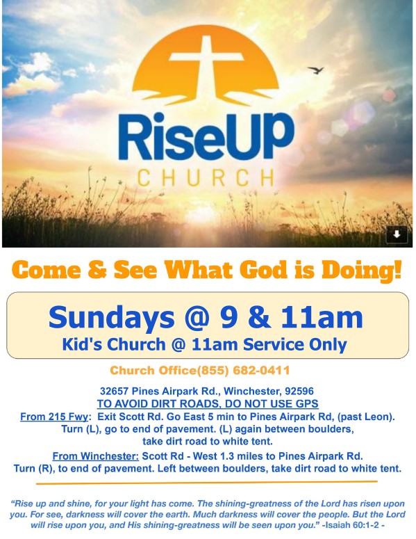 Contact RiseUp Email office@timetoriseup.org Phone (855) 682-0411 Address 32657 Pines Airpark RoadWinchester, CA 92596 Facebook @riseupchurch2020 YouTube Rise Up Church Instagram @rise_up_church